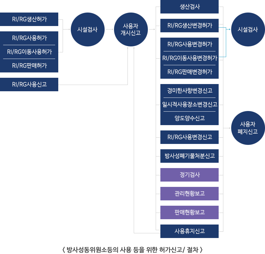 방사성동위원소 또는 방사선발생장치(이하 방사성동위원소등)를 생산·판매·사용 및 이동사용하려면 「원자력안전법 제5장 제53조」에 따라 원자력안전위원회에 신고하거나, 원자력안전위원회의 허가를 받아야 한다. 또한 허가사용자와 신고사용자는 허가를 받거나 신고를 한 후 사용 개시 신고를 하고 방사선을 이용해야 한다.